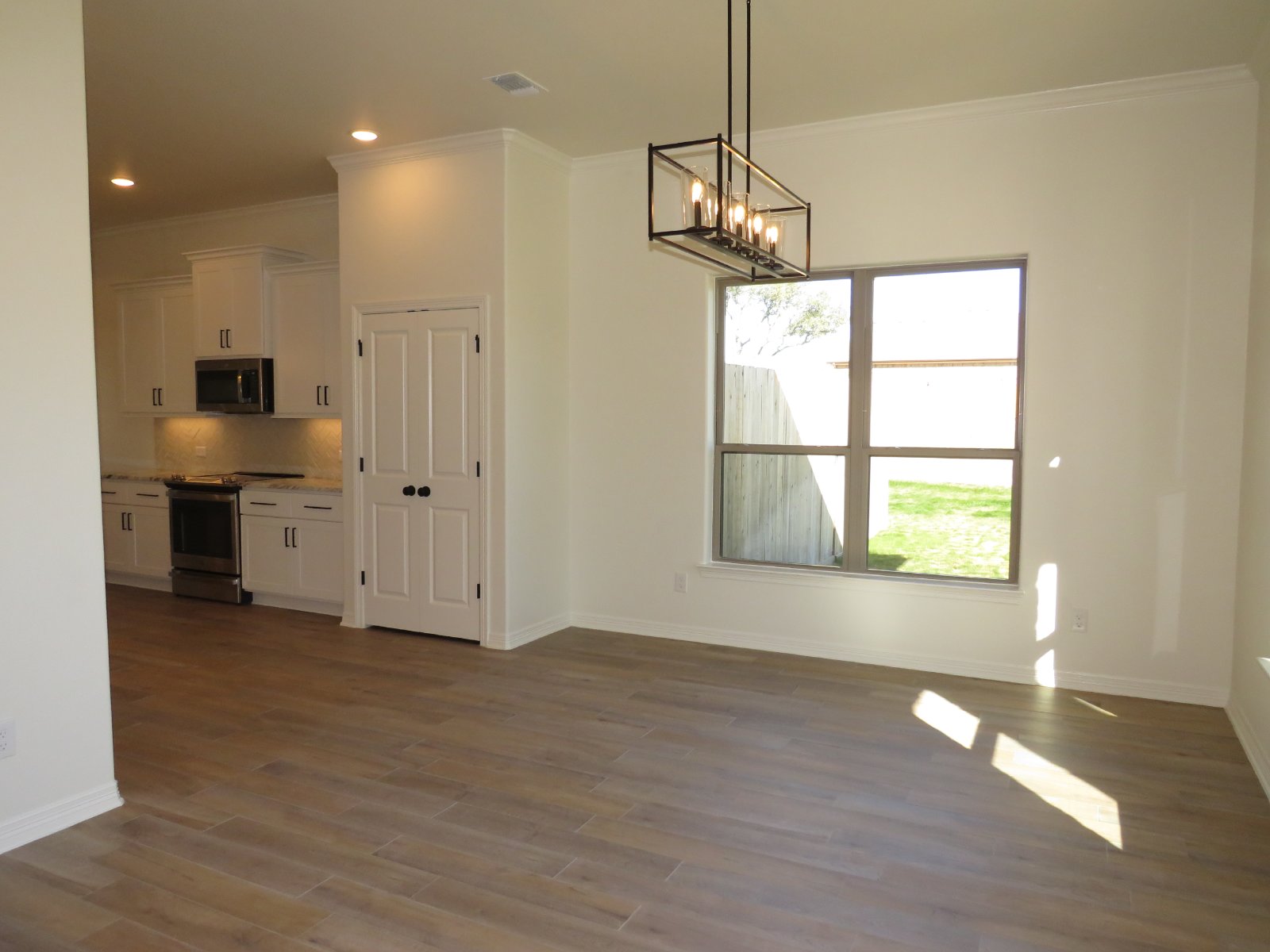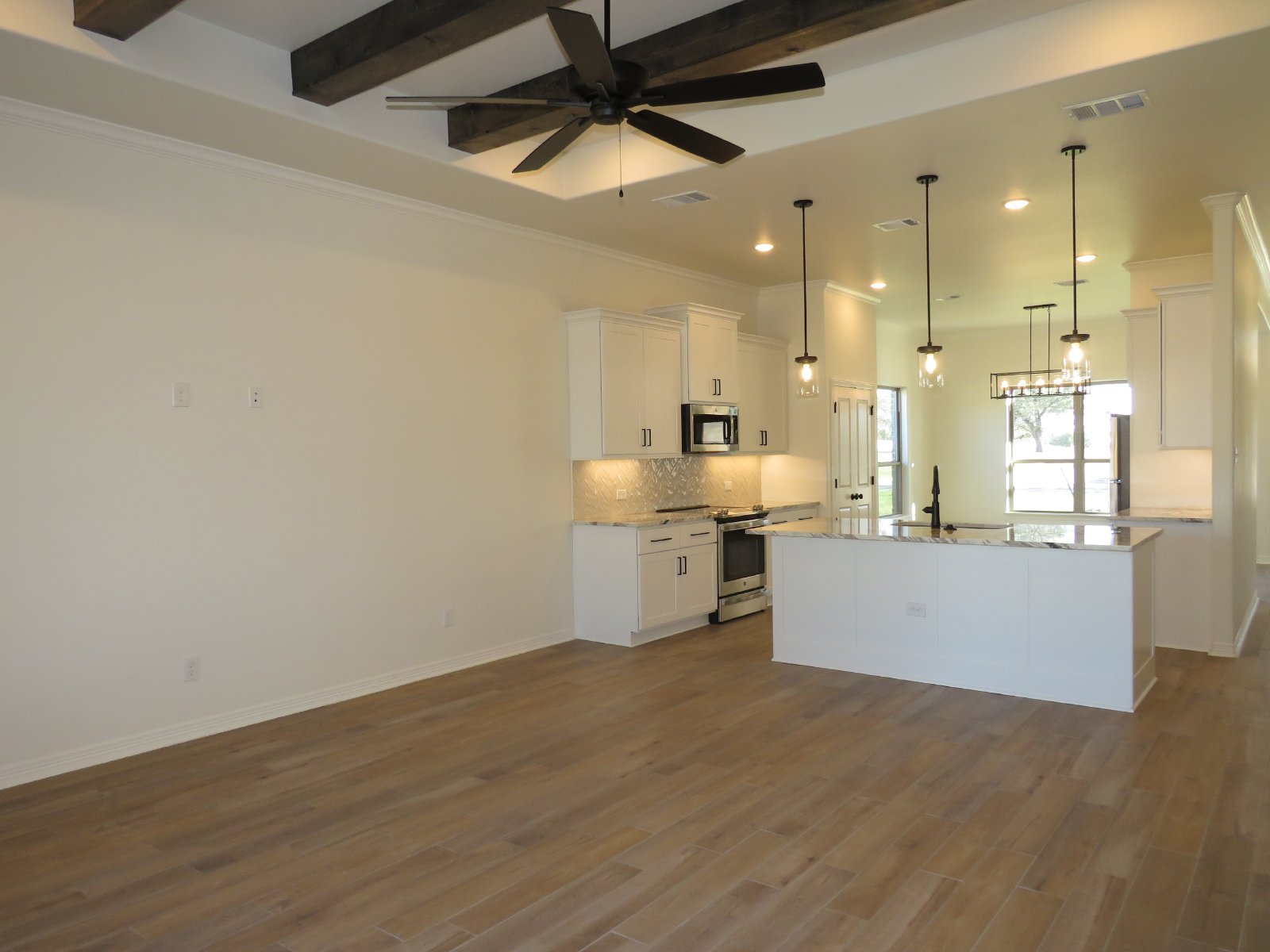 Welcome to this charming home featuring an open floor plan with a living room showcasing a coved ceiling with beams, and recessed lighting. The kitchen is equipped with an island, breakfast bar, granite countertops, pantry, and stainless steel appliances. The primary bedroom offers a separate shower, double vanity, and walk-in closet, while a laundry room provides washer/dryer hookups. Outside, enjoy a fenced backyard with a patio, ample windows throughout, and a 2-car attached garage, combining comfort and convenience seamlessly.