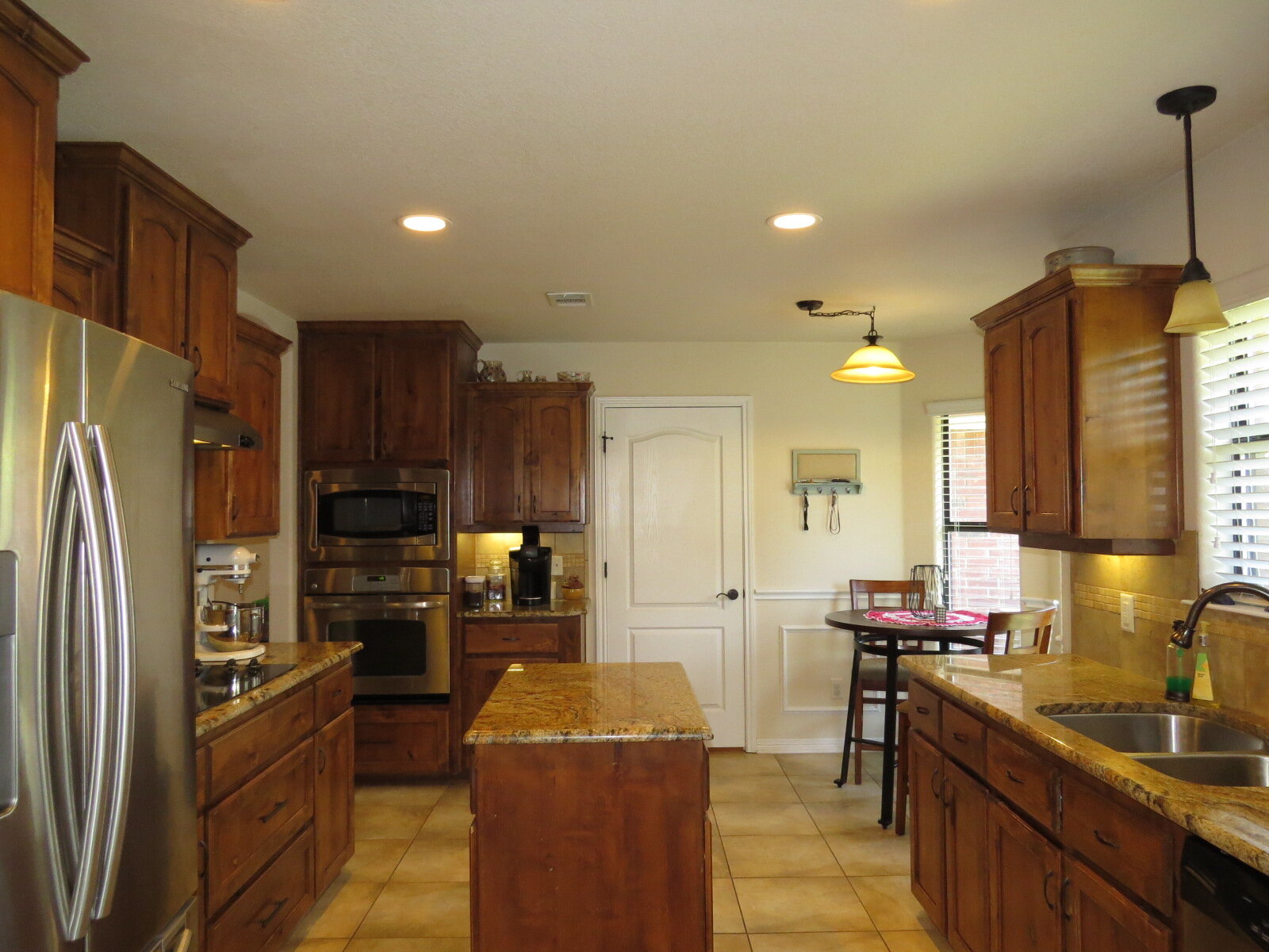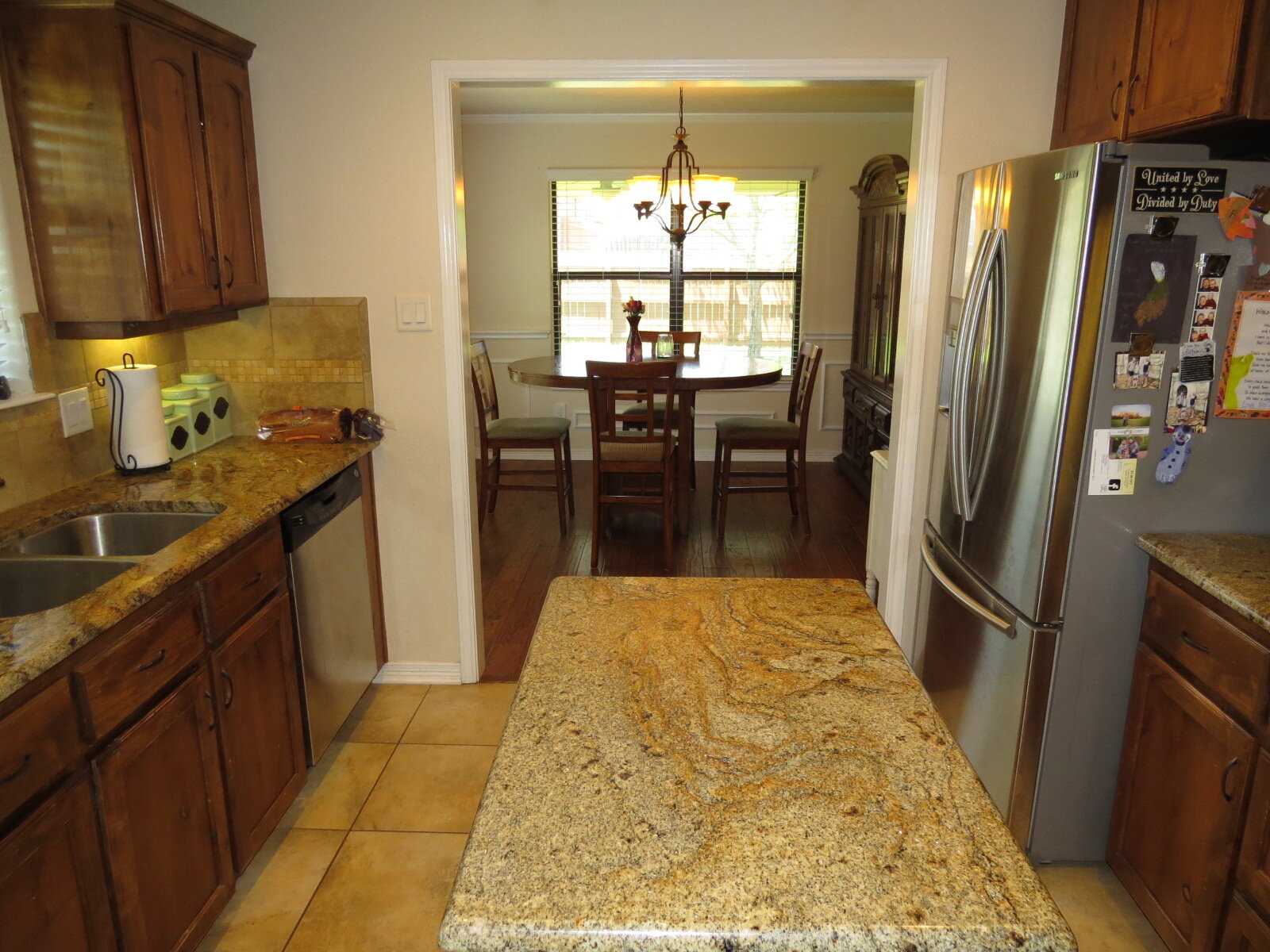 This home features coved ceilings and a cozy fireplace in the living room, creating a warm and inviting space. The kitchen is equipped with granite countertops, custom cabinets, a kitchen island, a pantry, and stainless steel appliances—perfect for both everyday living and entertaining.