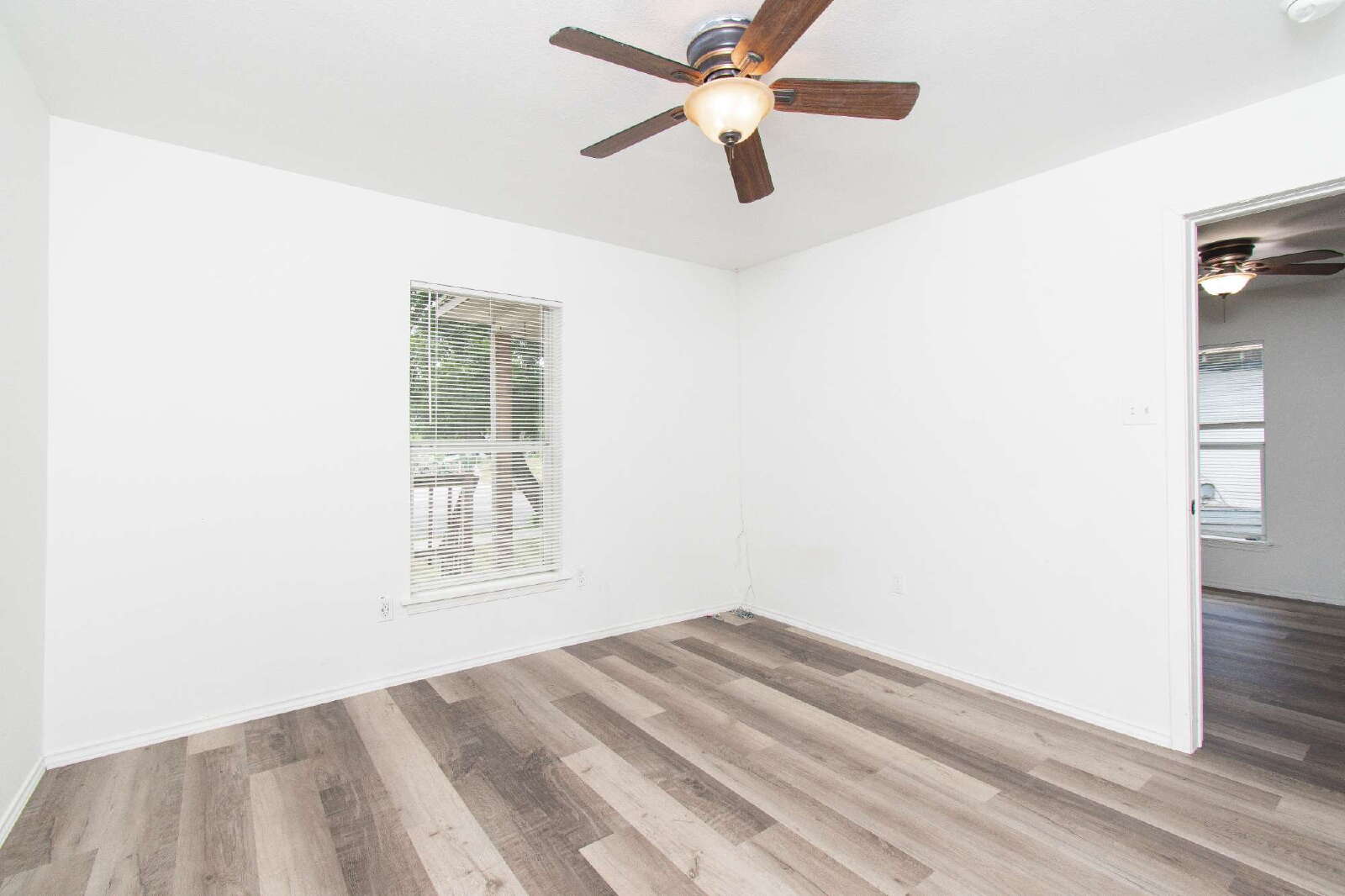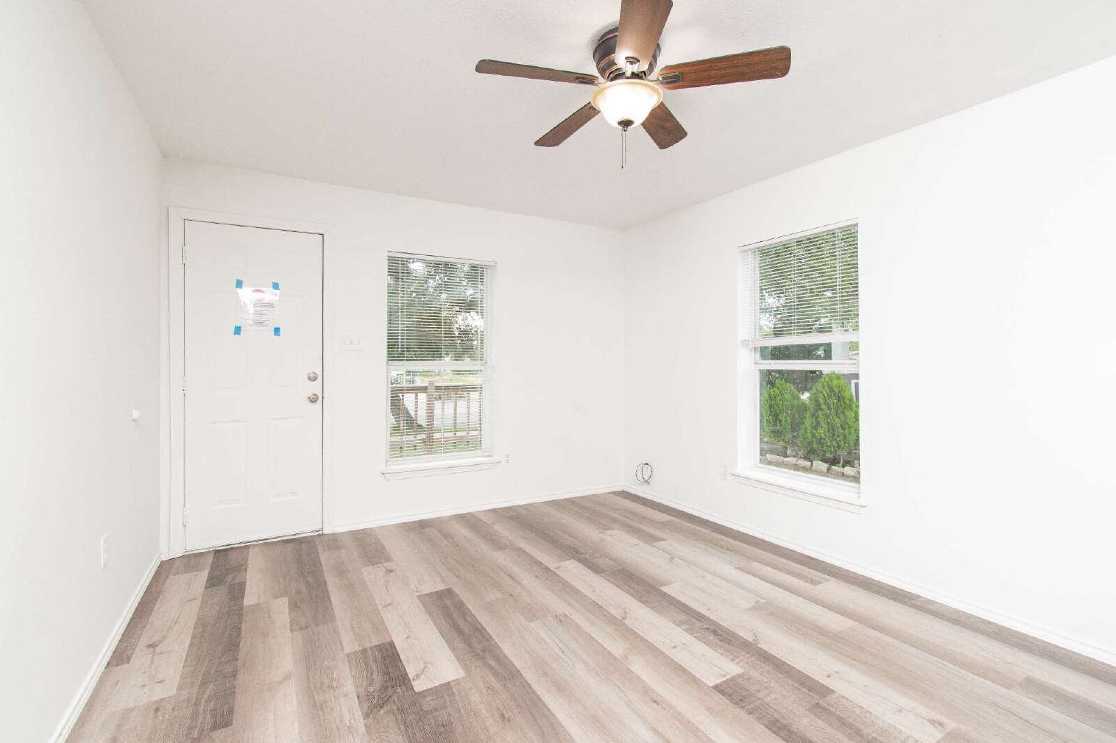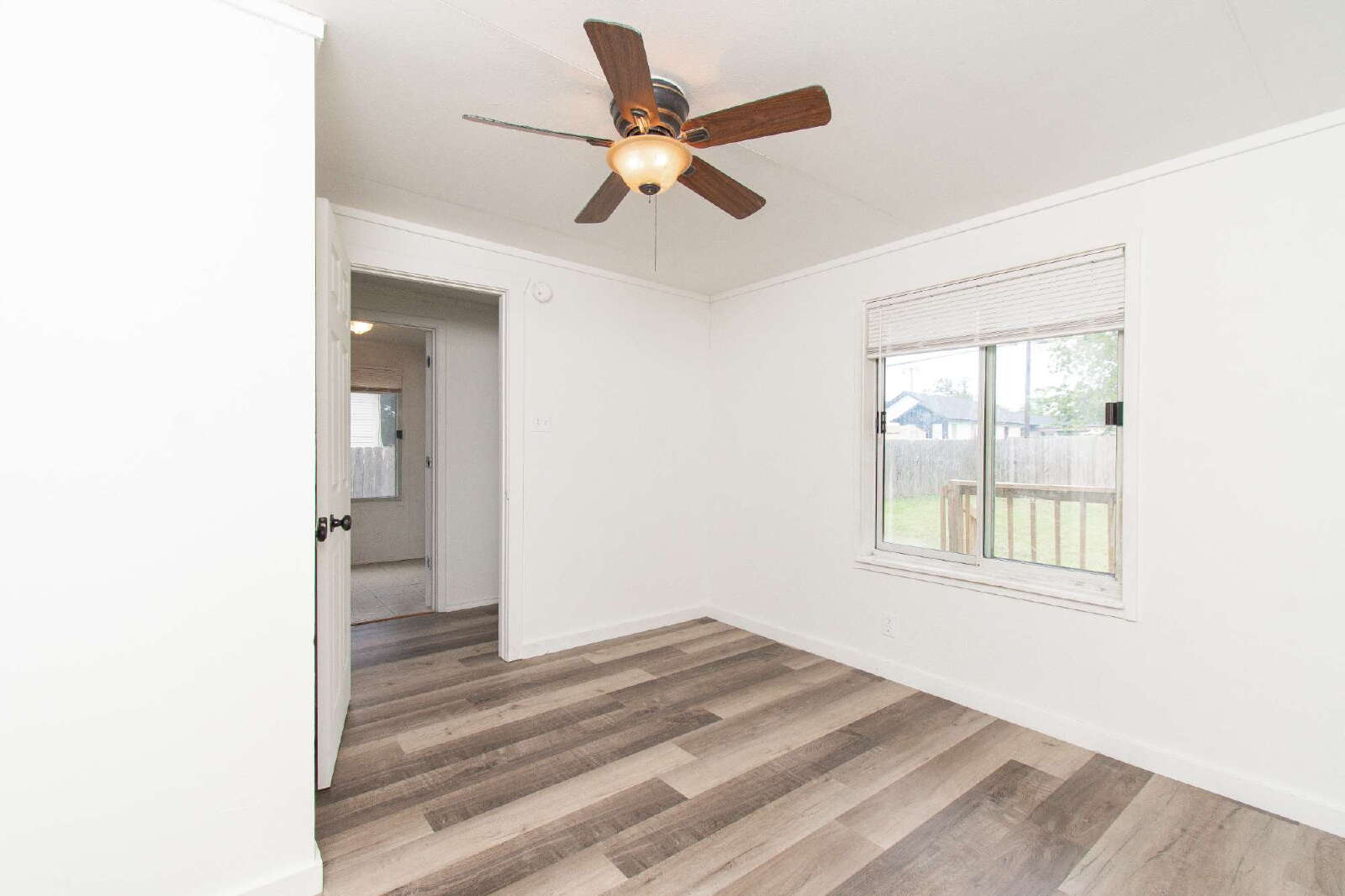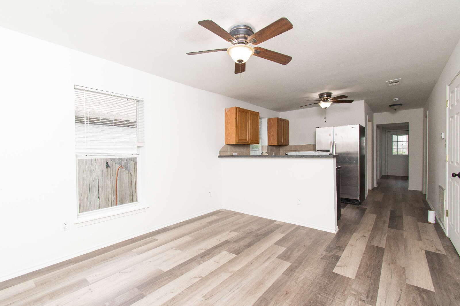 This home features laminate flooring and ceiling fans throughout, creating comfort and style in every room. The kitchen includes a breakfast bar, custom cabinets, and essential appliances. The rooms are comfortably sized, while the primary bedroom offers a shower/tub combo with a vanity. The privately fenced backyard provides space for outdoor enjoyment.
