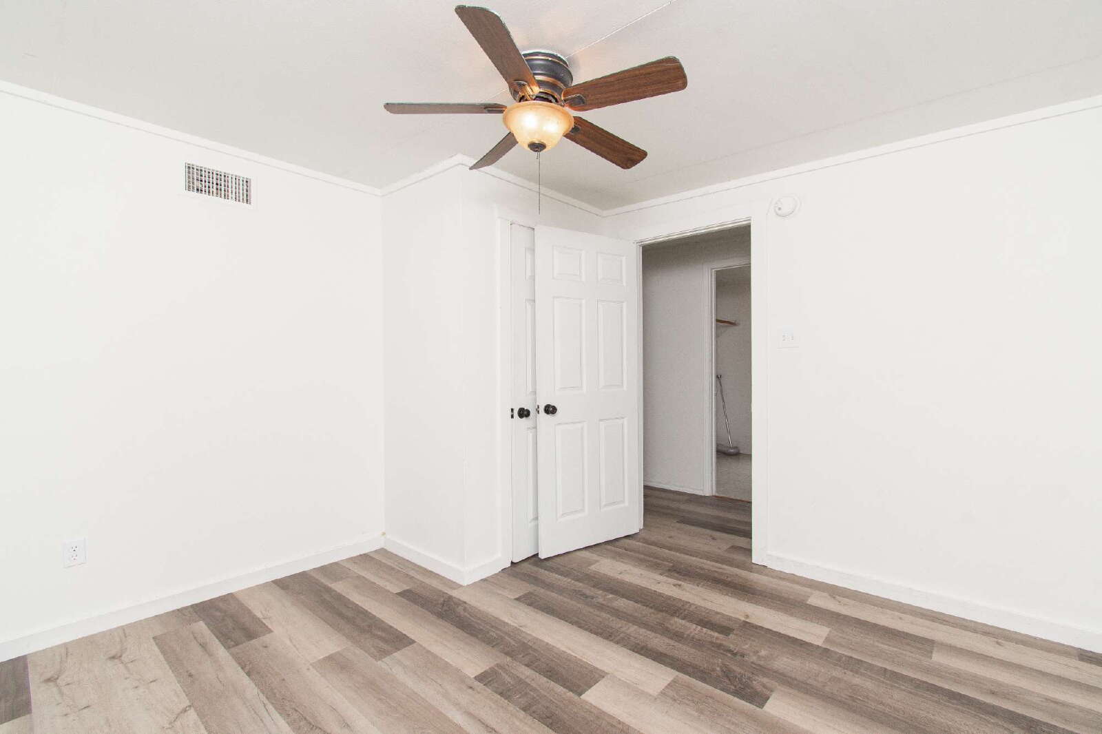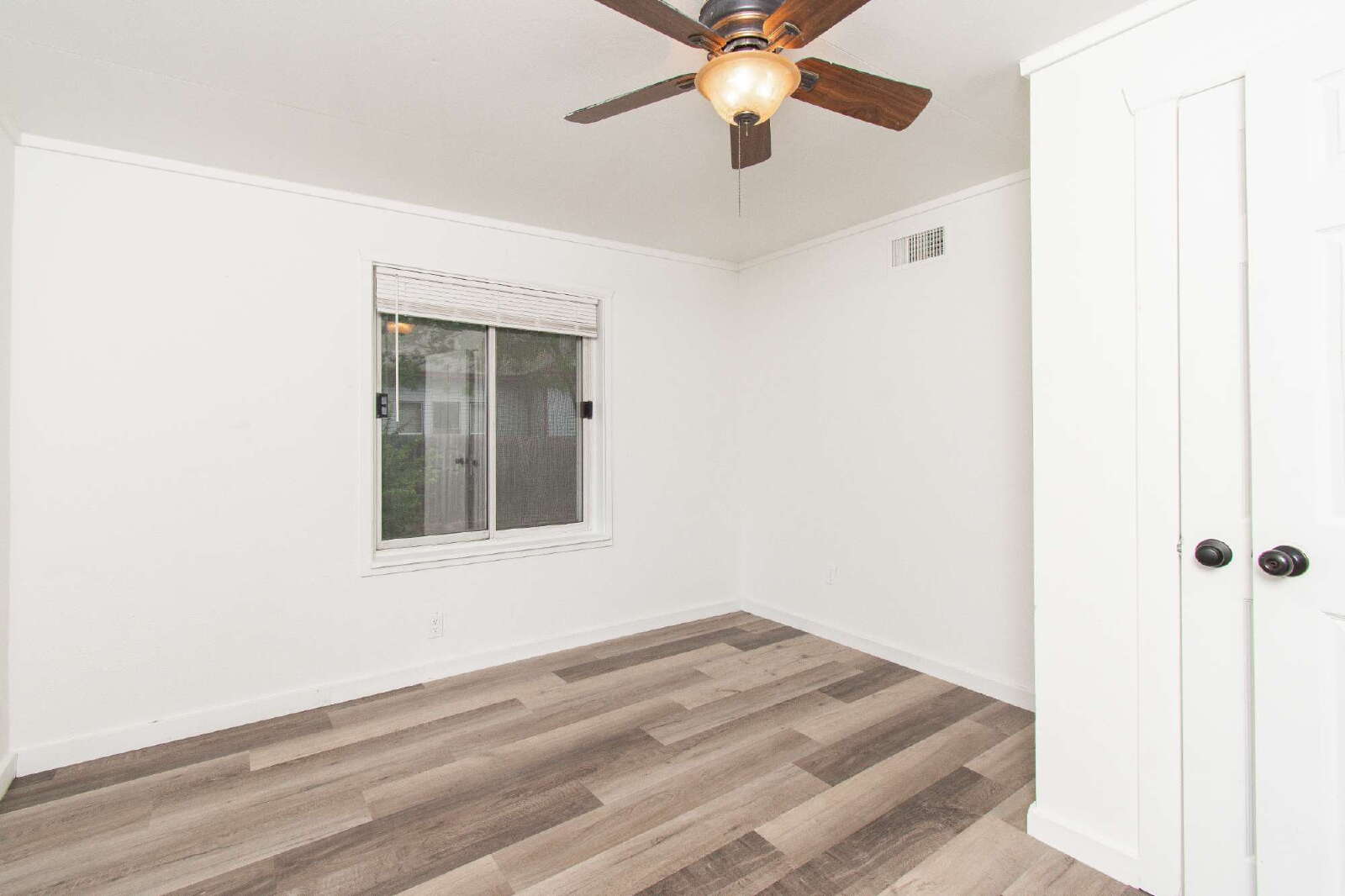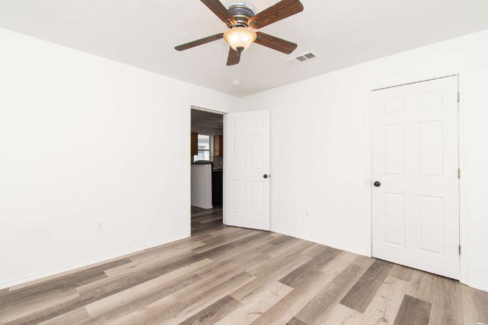 This home features laminate flooring and ceiling fans throughout, creating comfort and style in every room. The kitchen includes a breakfast bar, custom cabinets, and essential appliances. The rooms are comfortably sized, while the primary bedroom offers a shower/tub combo with a vanity. The privately fenced backyard provides space for outdoor enjoyment.