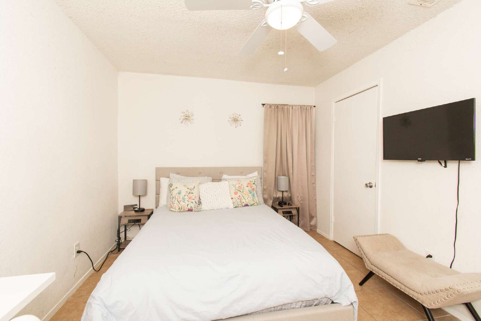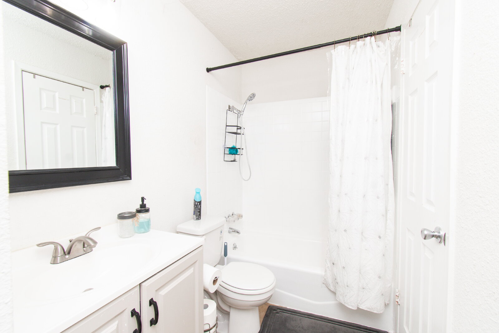 This cozy home features a kitchen with a breakfast bar, custom cabinets, and essential appliances. The rooms are decent in size, offering comfortable living spaces throughout. The primary bedroom includes a shower/tub combo and a single vanity for convenience.