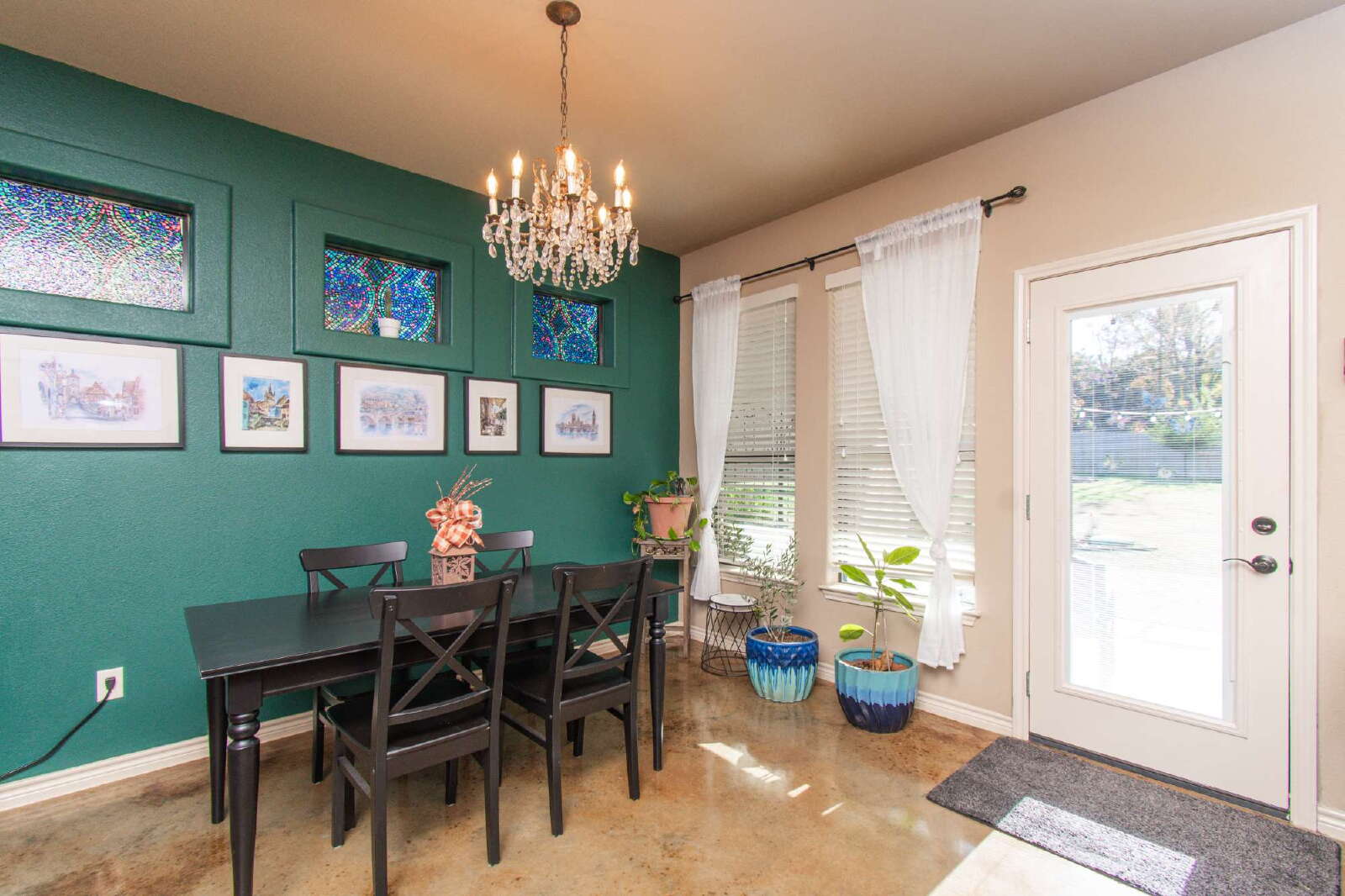 Step into this beautifully crafted home featuring concrete-stained floors that flow seamlessly throughout. The main family room offers a warm and inviting atmosphere with its high ceilings and cozy fireplace. The kitchen is designed to impress, equipped with recessed lighting, custom cabinets, granite countertops, a breakfast bar built into the center island, a pantry, and stainless steel appliances—perfect for everyday cooking and entertaining.