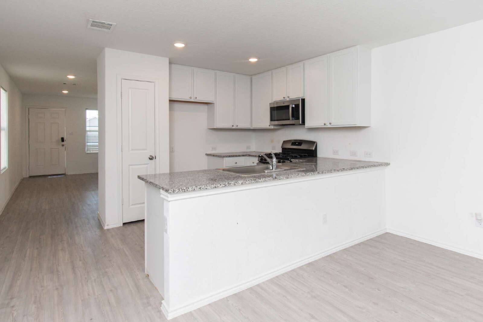 This home features an inviting open floor plan designed for comfortable living. The kitchen offers custom cabinets, granite countertops, a breakfast bar, a pantry, and essential appliances, complemented by recessed lighting throughout the main living areas. Washer and dryer hookups are conveniently included. The rooms are decent in size, with the primary bedroom featuring a shower/tub combination. Enjoy outdoor space in the privately fenced backyard, and added convenience with an attached front-entry garage.